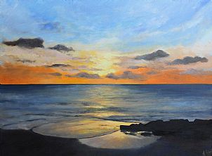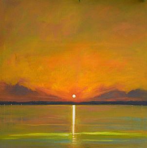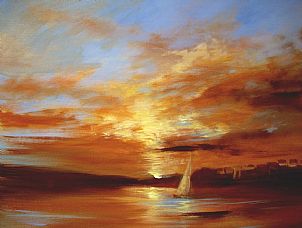 “If I had to choose a religion, the sun as the universal giver of life would be my god.” – Napoleon. We often take the sun for granted, that it will rise every morning and set every night. It is held up as a thing of magnificence, a great blazing fireball millions of miles away, the giver of life, all things grow under its glow and without it humanity would be plunged into eternal darkness. Artists have always tried to portray the beauty of the sun as the colours it creates are almost magical. It can turn the sky a radiant golden colour mixed with a dark red, as shown by Roger Colson. The sun even has the power to change the colour of the sea, giving it a glowing radiance and unpredictable feel as depicted by Samiran Sarker; or it can simply be bathed in for days on end, as painted by Peter Rodulfo. And it can break through dark clouds and once again bring hope and happiness to people, as Michelle Gibbs paints.