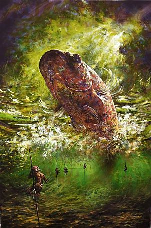 “Fishes live in the sea, as men do a-land; the great ones eat up the little ones.” – William Shakespeare.Sea creatures are something which we are still discovering more about every day. Deep down in the ocean there exist species of fish we have still not discovered, many of these deep sea fish are almost unimaginable. Some have long sharp teeth and others a light in front of them to attract their prey. With these unexplored waters it gives artists a great power of creativity, to create almost anything they could imagine living in the sea. Gabriel Bodnariu uses fish as the centre pieces of his artworks, he creates big almost mythological fish which one is glad can only survive in the water, although in his artwork ‘Fishing’, it feels as though the giant fish is going to explode through the canvas. Piotr Burger uses sculpture to re-create these deep sea fish, using wood metal and paint he manages to create sine amazing sculptures.