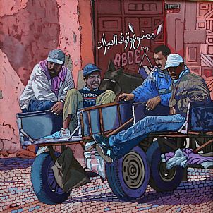 Marrakesh iv: Men resting on donkey trailer
